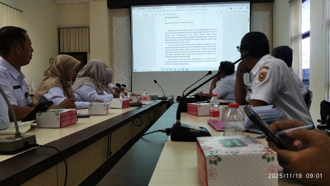 Rabu, 19 November 2025 DPMPTSP Kabupaten Purworejo mengikuti rakor pembahasan renaksi atas tindak lanjut rekomendasi KPK, di ruang otonom dihadiri seluruh OPD dan kecamatan