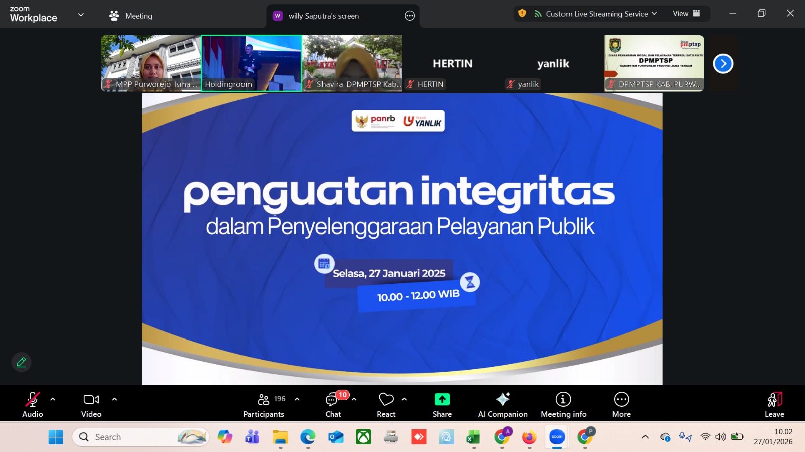 DPMPTSP Kabupaten Purworejo mengikuti kegiatan Penguatan Integritas dalam Penyelenggaraan Pelayanan Publik yang diselenggarakan oleh Kementerian PANRB, Selasa (27/1/2026), secara daring melalui Zoom Meeting.