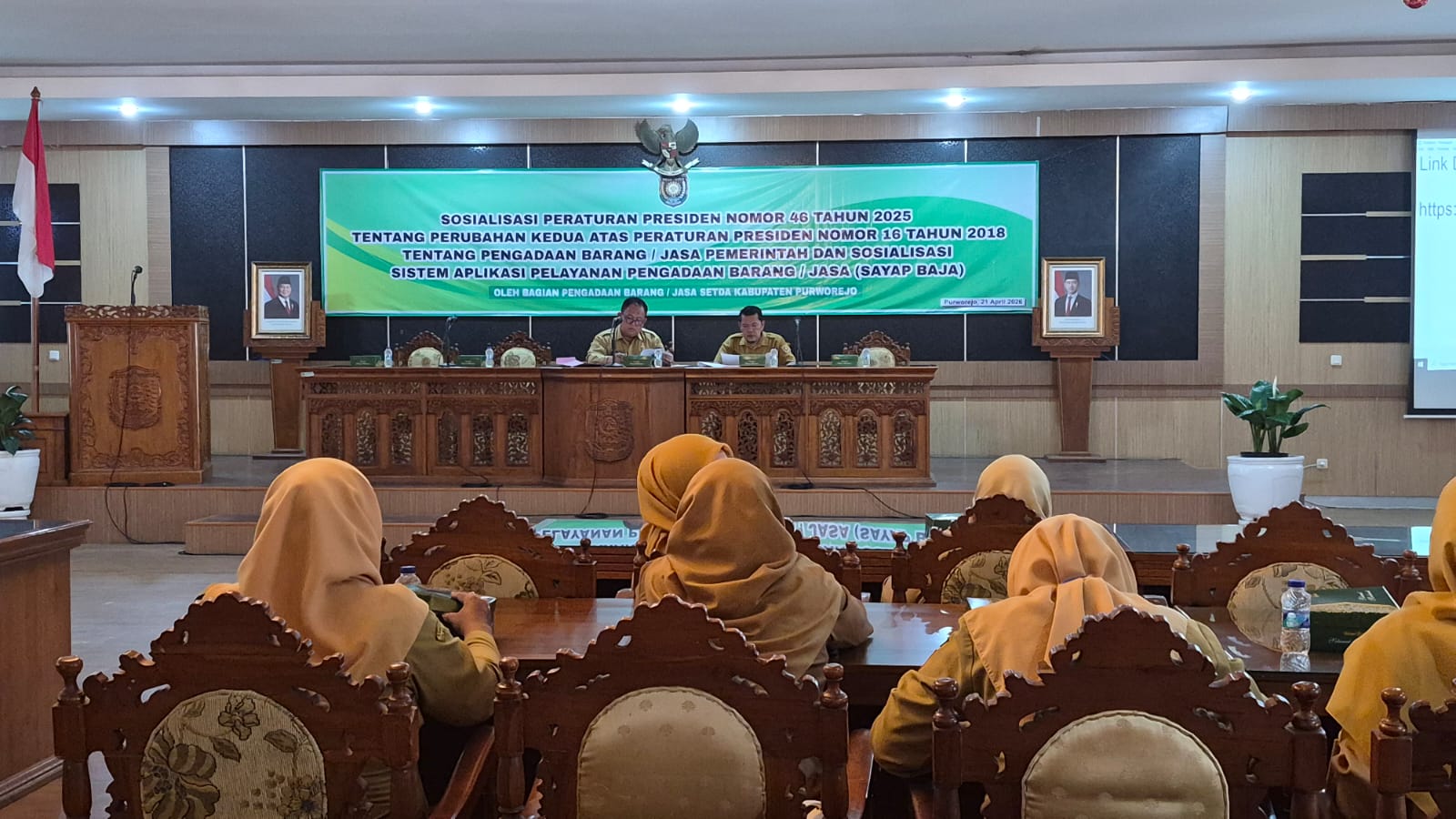 Selasa 21 April 2026 DPMPTSP Kabupaten Purworejo mengikuti Sosialisasi Peraturan Presiden No. 48 Tahun 2025 tentang Perubahan kedua atas Peraturan Presiden Nomoe 18 Tahun 2018 Tentang Pengadaan Barang dan Jasa Pemerintah dan Sosialisasi Sistem Aplikasi Pelayanan Pengadaan Barang/Jasa ( Sayap/ Baja ) bertempat di Ruang Arahiwang.